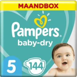 Pampers Baby-Dry luiers zijn verkrijgbaar in de maten 2 t/m 8 en daarmee geschikt voor baby's en kinderen van 3 t/m 30 kg. Ze zijn relatief duur in vergelijking met veel luiers van andere merken, maar vanwege hun populariteit altijd wel ergens in de aanbieding. Dat geldt ook voor de luiers met maat 5. Maandboxen Pampers zijn vaak in de aanbieding met kortingen tot 50%. Ook de standaard pakken zijn vaak via "2+1 gratis"-aanbiedingen te koop.
