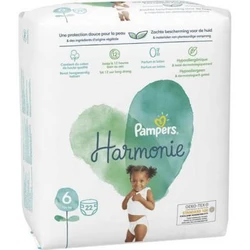 Pampers Harmonie maat 6 zijn luiers voor kinderen van 13 tot 30 kilogram. Harmonie luiers zijn luiers mét urine-indicator. De Pampers zijn het beste voor een baby met zeer gevoelige huid. De luiers zijn gemaakt van hoogwaardig katoen, zachte plantaardige vezels en andere zorgvuldig geselecteerde materialen. Ze bevatten geen parfum, lotion en chloorbleekmiddelen, en zijn dermatologisch getest.
